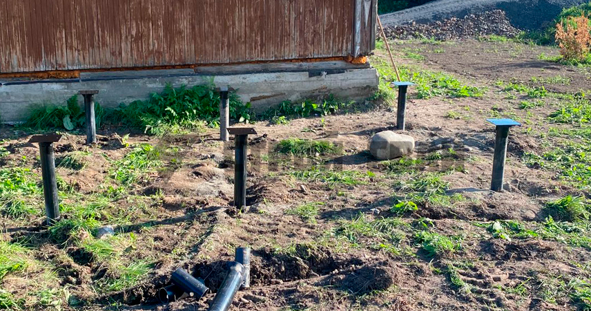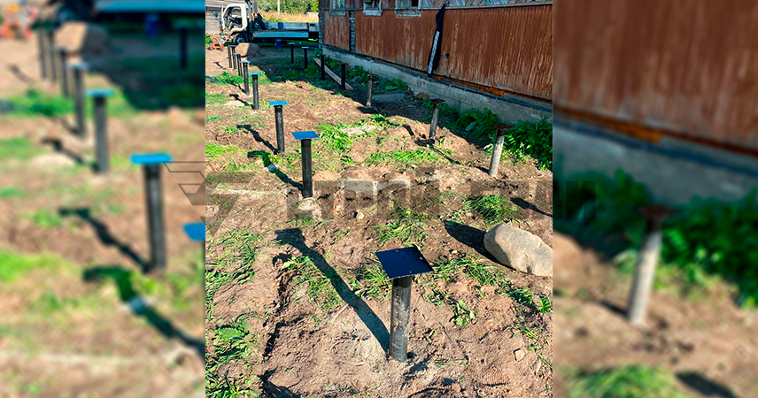 Пристройка на винтовых сваях — один из самых распространенных типов применения железных опор. Завинченные на глубину ниже уровня максимального зимнего промерзания, они не подвержены эффекту морозного пучения. Поэтому их можно включать в постройки на заливных фундаментах.