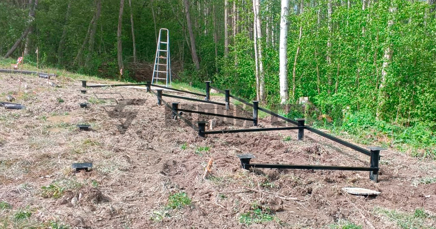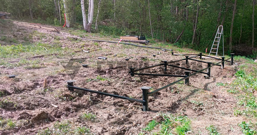 Монтаж винтовых свай на уклоне желательно дополнять обвязкой по косой горячекатаным металлопрокатом. Так как плотность грунта выше и ниже по склону отличается, свая без обвязки рискует сместиться с вертикальной оси.