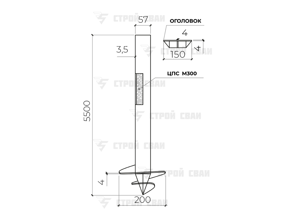 Каждая СВС 57/5500/3,5 — это стандартная конструкция стальной опоры. Ее основание — полая труба, на нижнем конце которой сформирован наконечник. По его поверхности приварена спиральная лопасть, обеспечивающая столбу статичность в любом грунте.