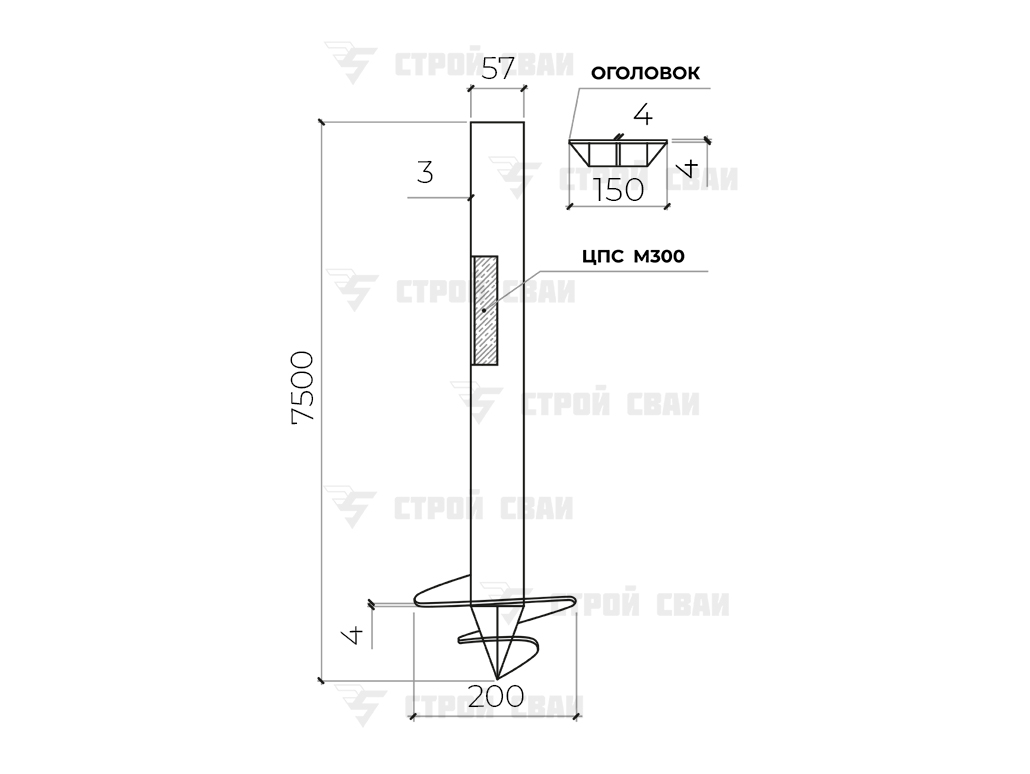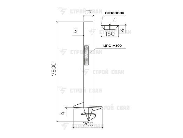 Каждая СВС 57/7500/3 — это стандартная конструкция стальной опоры. Ее основание — полая труба, на нижнем конце которой сформирован наконечник. По его поверхности приварена спиральная лопасть, обеспечивающая столбу статичность в любом грунте.