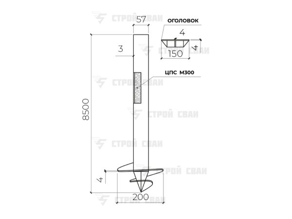 Каждая СВС 57/8500/3 — это стандартная конструкция стальной опоры. Ее основание — полая труба, на нижнем конце которой сформирован наконечник. По его поверхности приварена спиральная лопасть, обеспечивающая столбу статичность в любом грунте.