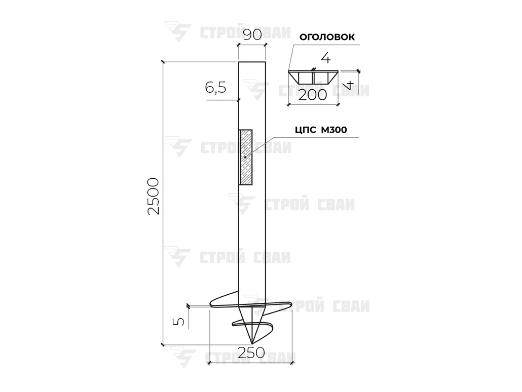 Конструкция СВС 90/2500/6,5 ничем не отличается от изделий других типоразмеров: это стальная труба определенной длины и диаметра, на нижнем конце которой сформирован острый наконечник с закрепленной при помощи сварки спиральной лопастью. Благодаря балансу параметров каждый столб обладает высокой прочностью и несущей способностью.