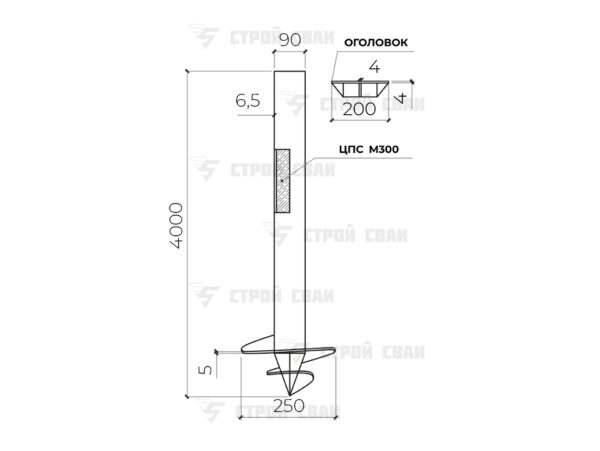 Конструкция СВС 90/4000/6,5 ничем не отличается от изделий других типоразмеров: это стальная труба определенной длины и диаметра, на нижнем конце которой сформирован острый наконечник с закрепленной при помощи сварки спиральной лопастью. Благодаря балансу параметров каждый столб обладает высокой прочностью и несущей способностью.